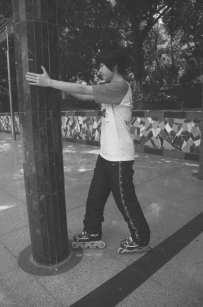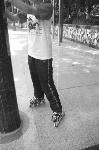 (2)站立左右推鞋,手扶栏杆、墙体或在同学帮助下,相距一脚左右的距离平行开立,用轮滑鞋内外刃在原地做两脚交替左右推动,体会轮子左右滑动的摩擦力(图13.2.7)。