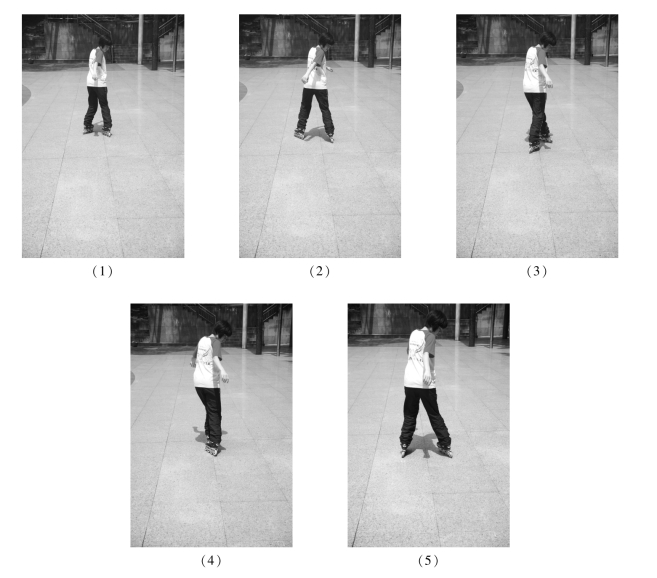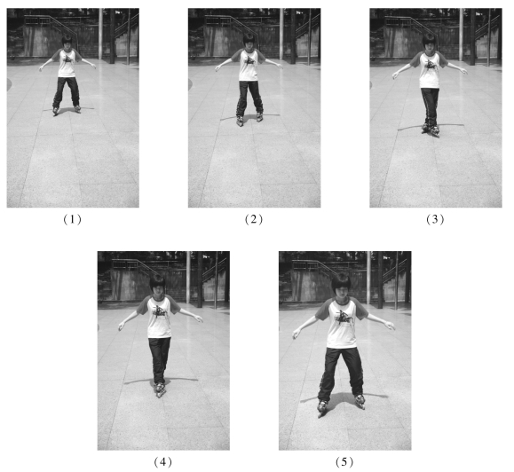 双脚尖外展“V”字形站立,起滑时身体稍前倾,两膝弯曲用力,两脚尖外展以内刃蹬地,两臂左右伸开或置于体侧帮助维持身体平衡。双脚向前外滑出至最大弧线(两脚距离稍宽于肩)后,两脚尖内收靠拢,当两脚靠近相距一脚左右时,一脚在前,一脚在后,重心落在两脚之间,两脚继续向对侧腿“挤推”,成两腿交叉向前滑行。同时,两脚迅速由内刃向前滑行变为外刃向前滑行,直至两腿交叉的最大幅度。然后两脚尖外展,两脚以外刃“V”字形向后外侧蹬地还原成两脚平行状态。当两脚还原平行后迅速由两脚外刃分开和靠拢、交叉和还原的滑行,不断向前滑进(图13.4.5)。