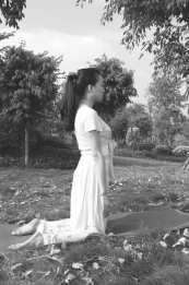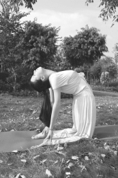 跪坐,小腿平放,脚面压地,双膝打开与髋宽。吸气,双手前平举,臀部离开脚后跟上体立直,大腿及上体成一直线与地面垂直。呼气,髋前推,身体后仰,抬头,先右手抓住右脚跟,再左手抓住左脚跟。保持腹股沟、小腹与大腿成一垂直线。保持姿势,缓慢地呼吸5~6次。吸气时,双手收回放在腰处,慢慢抬起上体,回到起始姿势。闭上双眼,轻柔地呼吸,调整休息(图14.2.18、图14.2.19)。