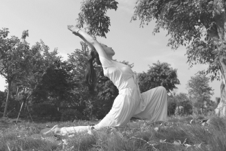 成俯卧撑式,背、臀、腿成一斜线。吸气,右腿向前迈一大步成弓步,呼气,抬起上体,双手合十直臂向前、向上、向后画圈,抬头后仰,眼睛看眉心,收紧背部、腰部和左臀,伸展右腹股沟、腹部、胸部、喉和下巴。保持姿势,均匀地呼吸3~5次。吸气,慢慢的收腹,双臂从后向上、向前、向下返回到初始姿势,呼气放松。反方向练习(图14.2.21)。