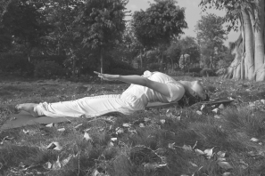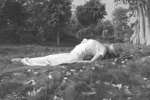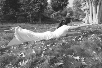 俯卧,下巴触地,双臂前伸,双腿伸直,臀部收紧,脚尖绷紧。吸气,上体、双臂和双腿向上抬起,抬头,眼睛看眉心。使整个背部、腿、手绷紧。保持姿势均匀地呼吸3~6次。呼气时缓慢地放下双臂和双腿。附在地上放松休息(图14.2.20)。