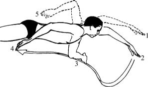 (4)出水:划水结束时,掌心转向大腿,出水时小指向上,手臂放松,微屈肘。由上臂带动,肘部向外上方提拉带前臂和手出水面,掌心转向后上方。出水动作必须迅速而不停顿,同时应该柔和、放松。