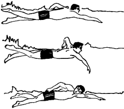 ③滑行打水:练习时要求闭气,两臂伸直并拢,头夹于两臂之间。