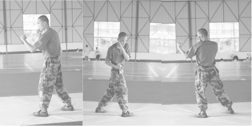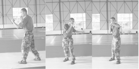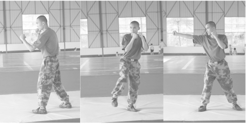 动作要领(以左直拳为例):右脚微蹬地面,上体微右转,左臂由屈到伸,力达拳面(图18.2.2)。