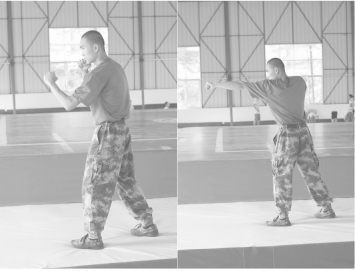 动作要领(以左鞭拳为例):左脚上步落于右脚前并稍内扣,身体右后转约180°,随即右脚经左脚后插步,身体继续右后转,同时以腰带动右臂向左侧横向鞭击,拳心向下,力达拳轮。左拳自然收护于颌前(图18.2.5)。