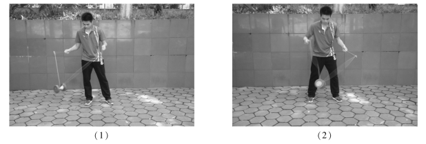 方法与要点:两臂屈肘,上臂与前臂保持基本垂直,前臂基本水平;右手持竿有节律地上、下抖动,使空竹保持旋转(图22.2.6)。