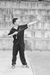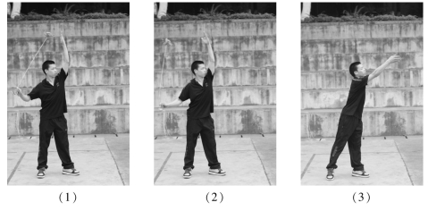 动作要领:左手稍用力将绣球上抛,同时右手向后拉绳,开臂,绣球以提绳为半径,右手握绳处为圆心,绣球在身体右侧,按顺时针方向运动,同时蹬腿,送髋,伸臂送腕,重心前移,当绣球绕至前上方时,顺着球的惯性将球以合适的角度抛出。左臂自然平屈于胸前(图23.2.2)。