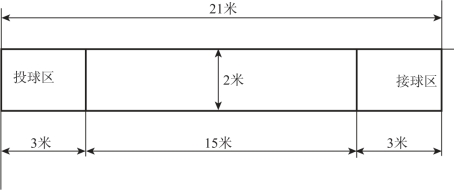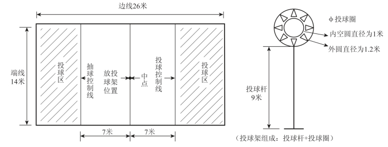 场地长26米,宽14米,长边的界线叫边线,短边的界线叫端线,在中线两侧各7米的地方,各画一条与中线平行与边线相连接的投球控制线,投球控制线到端线之间的区域为投球区,在中线的中点立一根高9米的杆,杆顶安一个直径1米的圆圈,为投球圈(图23.2.8)。