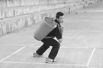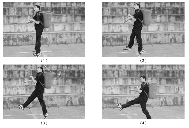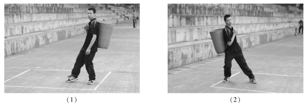 (1)接球手背篓面对投球手站立于接球区内,面对投球手投来的绣球,判断来球落点,或侧或前或后移动,或蹲或半跪将来球接入篓中(图23.2.3)。