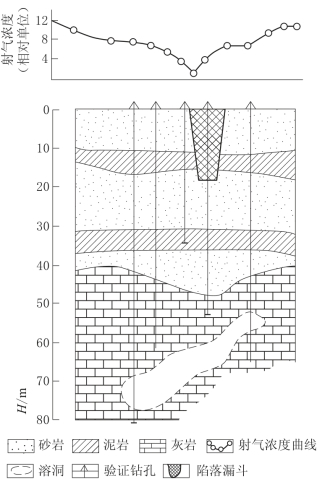 喀斯特探测主要是探测建筑区岩溶漏斗、溶洞、暗河的平面分布和岩溶地下水的分布等情况,主要使用电法勘探中的电测深和电测剖面法、自然电场法、激发极化法、甚低频法、PS(Petro-Sonde)岩性测深法、无线电波透视法、声波透视法、地质雷达、微重力法等。这些方法也可用于探测煤矿采空区、废弃坑道及其他洞穴。图0-3为广西德保县那甲乡多凌屯的高密度电阻率法中微分测量装置的电阻率反演结果,可以发现,在20m以上为覆盖层,在23~30电极之间深度为42.5m以下有1个低电阻率异常体,即灰岩中的溶洞。此外,用测温法可查明水下和地表下地下暗河的出露点。