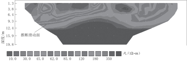 这方面的探测内容很多,面广量大,如对水域面积、江河湖海岸及滩涂变迁,沙漠、冰川冻土、森林和植被覆盖、可耕地的变化,以及区域滑坡、泥石流、黄土崩塌、水土流失、地面塌陷、水域水质变化等进行普查、勘查、动态监测和预测。使用的方法是多种多样的。如用高密度电阻率法对襄十高速公路武许段某边坡的稳定性进行评价(图0-4)。当滑坡体上有钻孔时,可以用充电法确定滑动方向和滑动速度。又如1986年9月在杭州玉皇山脚下开凿隧洞,引钱塘江水更换西湖湖水时,就用自动测井仪在换水过程中测量水电阻率的变化,确定了更换水(混合流)的运动方向、路线、速度、分布形态,揭示了湖水更换的基本规律,为换水效果和经济合理的换水方案提出了依据。这是用物探方法开展环境保护和治理的成功例子。