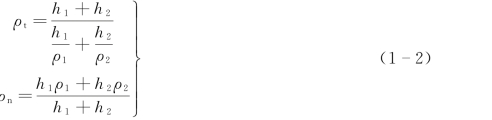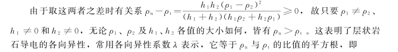 岩石中含针、片状矿物较多时,横向电阻率ρn总是大于纵向电阻率ρt,且随矿物颗粒形状、导电性不同而有差异(图1-1)。对于由两种薄层交替成层的情况,设其电阻率和厚度分别为ρ1、h1,ρ2、h2,则按电阻并联和串联,可计算出沿层理方向和垂直层理方向的电阻率ρt和ρn为