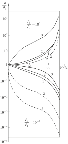图1-1 岩、矿石电阻率与矿物颗粒体积含量的关系曲线