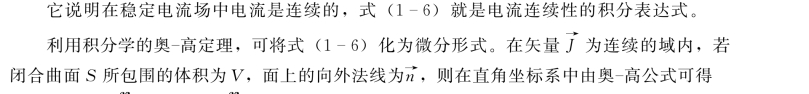 这就是电流连续性的微分表达式。它表示电流密度矢量沿直角坐标系的三个方向的空间变化率的总和为零。即在稳定电流场中,电流线是连续的,除电源点外,空间任何点上不会有正电荷或负电荷的积累。