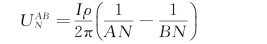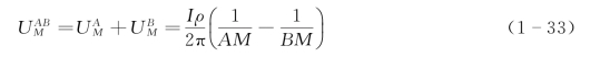 如图1-3所示,前面已计算了A极、B极在观测点M上产生的电位UAMB。同理,很容易求出地面电阻率法中A极、B极在另一观测点N上的电位(图1-4)为