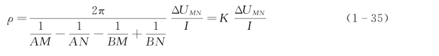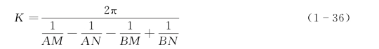 式(1-35)和式(1-36)是在地面上或在岩石露头上测定均匀各向同性半无限介质真电阻率的公式。K为装置系数或排列系数,决定于各电极间的相对位置。