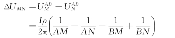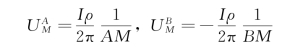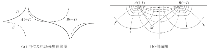在地下为均匀介质的地面上,放置两个极性相反的电极,电流+I由A极输入地下,而由B极(-I)自地下流出,构成闭合回路。当两电极彼此相距不远时,根据电场的叠加原理,地下半空间某点M的电位应是A、B两电流源分别在该点产生的电位