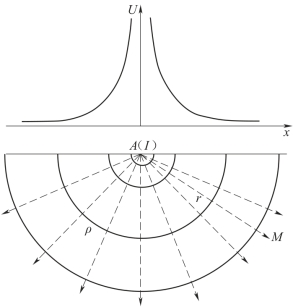 假设在电阻率为ρ的均匀各向同性的地下无限介质中埋有一个供电电极A,由于电极本身的尺寸很小,与电极到观测点的距离相比,小到可以看作一个点,因此称为一个点电流源。另一个供电电极B置于距A很远(可以认为是“无穷远”)的地方,那么A极附近的电场将不受B极的影响,或影响甚微,可以忽略不计。这样就得到一个点电流源的电场[12]。
