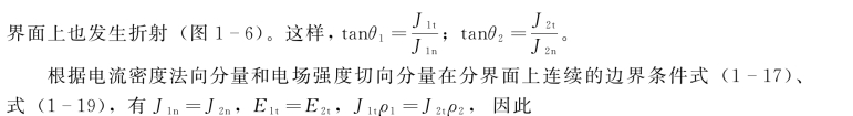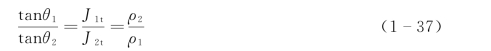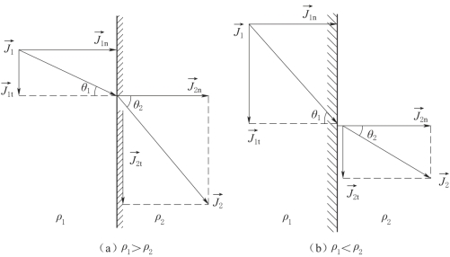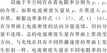 若电流线从高阻介质进入低阻介质,则θ2>θ1,折射方向偏离界面法线方向。若ρ2很小,折射后电流线几乎与界面平行,这时J2t≫J1t,低阻体具有吸引电流的能力。反之,ρ1<ρ2时,θ1>θ2,电流线接近界面法线方向,J2t<J1t,高阻体具有排斥电流的能力。若ρ2很大,甚至能将初始电流全部排斥到周围介质中去。总之,介质中电流能通过低阻体和避开高阻体、按照所遇阻力最小的路径流动,或者说地下电流的分布总是自动地满足电场做功最小的状态。