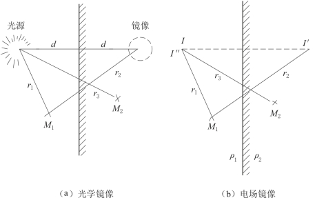 镜像法就是把电场中存在的不同介质分界面看作一面镜子,分界面的影响用一个位于实际电源的镜像位置的虚构电源来代替,这时电场可视为由实际电源和虚电源共同产生。根据唯一性定理,最后求解的结果与实际情况产生的电位是完全一致的。