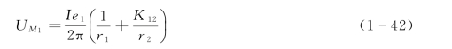 设空间有一平面,平面两侧介质电阻率分别为ρ1和ρ2(图1-8)。观测点M1与电源I同在ρ1介质中,虚电源I'在ρ2介质中与场源I对称的位置上,相对于分界面而言,I'恰为I的镜像。这样,M1点的电位应由两部分组成,第一部分是电源I在M1点产生的电位,第二部分是由虚电源I'(电流的反射部分)在M1点产生的电位,根据式(1-26),M1点的电位为
