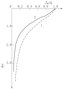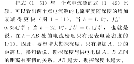 研究电流密度随深度的变化规律对电阻率法勘探有重大意义。因为,地面电阻率法根据地表电流密度的变化来判断地下电阻率有明显差异的地质体存在与否。集中于地表的电流越多,流入地下深处的电流就越少。当埋藏于深部的岩石中的电流密度很小时,岩石电阻率的差异对地表附近电流密度的影响很小,因而能够进行勘探的深度也就小了。下面我们讨论电流密度随深度的变化规律。
