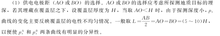 (2)测量电极距(MN)的选择。应在不明显降低异常的前提下,尽量采用较大的电极距MN,同时使MN等于测点距或两倍测点距,而测点距的选择应根据异常范围大小确定。由ρs曲线特征知,在探测目标两侧(交点两边)联合剖面曲线的异常范围大约等于2AO。在详查时,为了能得到完整的曲线,在2AO范围内常要求应有6~10个测点。所以,测点间距一般选为AO的(1/5~1/3),于是MN=(1/5~1/3)AO,甚至MN=1/10AO。