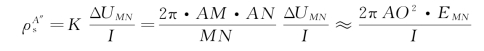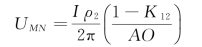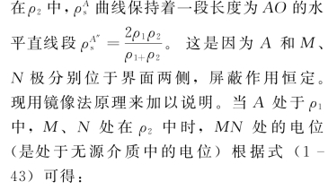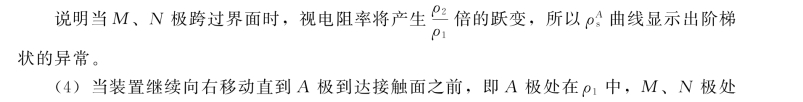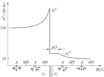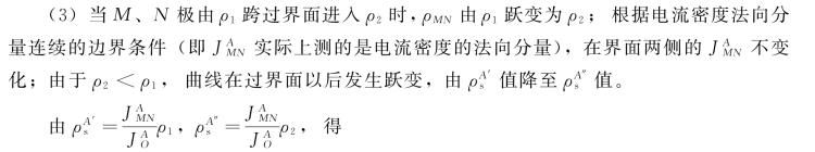 (1)当装置距离接触面很远(实际上只要大于2AO就可算很远了)时,界面的影响可以忽略,地中电流的分布与只有ρ1岩石时的均匀介质相同。由式(1-47)写出这时的视电阻率: