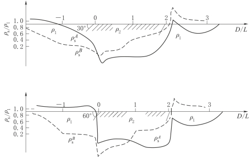 图2-13 高阻厚板(倾角为30°)上联合剖面曲线(ρ2>ρ1)