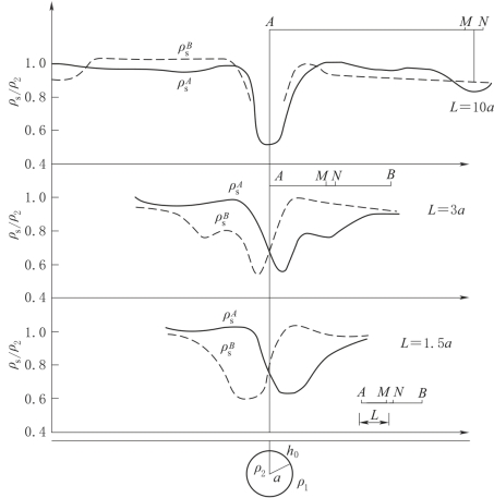 当L=3a>h0时,两条ρs曲线的极小值相互靠拢,且在两侧出现一个次级的极小点。这是供电电极A或B过球顶上方时,电流被良导球体吸引,使JMN减小的结果。