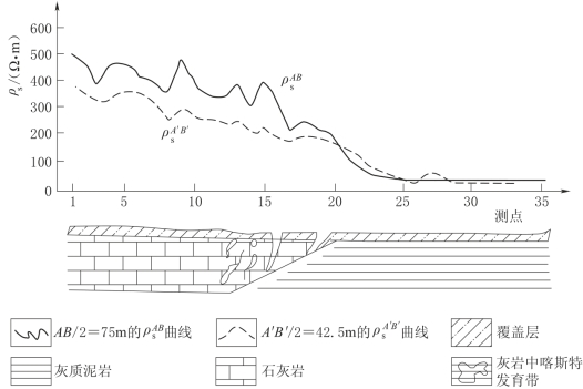 图2-26是横穿岩层倾斜界面的复合对称四极法ρs剖面曲线。曲线呈明显的阶梯状,而且小极距的曲线的界面特征点位置向反倾斜方向位移。喀斯特多沿界面一侧的石灰岩发育,在ρs曲线上表现为