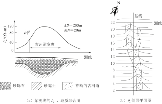 图2-23是我国某地应用对称四极剖面法寻找古河道的实例。充填于古河道中的砂砾石的电阻率比河床两侧砂黏土的电阻率大得多,所以在古河道上方ρs曲线明显升高,为高阻异常。根据ρs剖面曲线极大值两翼转折点之间的距离,可大致确定古河道的宽度。根据ρs剖面平面图上各条测线ρs曲线的变化特征,圈出了由一条干流和一条支流组成的古河道的范围。