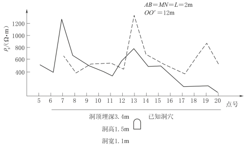 京广线范家园至汩罗的铁路,地下古代掏金洞穴塌陷而引起路基沉陷,影响正常运营。该地段表土为黏土夹少量砾石,厚1~10m;其下为砂卵石层,含黏性土和金砂,掏金洞位于该层内,埋深为3~6m,洞高1~1.6m,宽0.8~2m,断面呈拱形,无一定方向,地表为低洼地带。为查明路基下暗藏洞穴的分布,曾在几处已知洞穴处做物探试验。洞穴为位于地下水位之上的空洞,电性上应为高阻反应,而砂卵石层胶结紧密亦呈高阻反应。试验中发现对称四极、联合、中梯法装置对高阻洞穴均无明显反应。唯独用偶极剖面法,采用AB=MN=L=2m,OO'=12m(约为3倍洞穴埋深)所得剖面曲线能获得明显异常(图2-34)。其异常特点是:在洞穴顶部,两条曲线同时出现高阻异常,在异常的前后两端相距OO'处,各出现一个高阻副异常,呈镜像反应。用偶极剖面法圈定的洞穴地段均被钻探和施工开挖处理所证实。