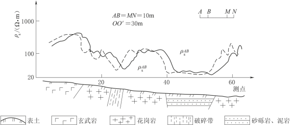 图2-33是用偶极剖面法查明覆盖层下花岗岩中破碎带分布及确定第三系地层与花岗岩分界面的实例。采用AB=MN=10m,点距为10m,OO'=30m。图中破碎带上ρs曲线反映为低阻,并有明显的正交点,第三系砂砾岩,泥岩的电阻率更低,曲线呈凹槽。根据凹槽两侧ρs曲线上升最陡处可划定它们与花岗岩的分界线[17]。