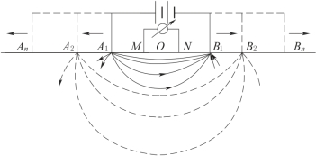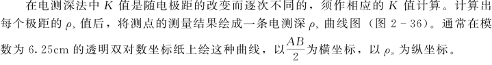 电阻率测深法亦可称为电阻率垂向测深法,或简称为电测深法。它是研究指定地点近于水平产状的岩层沿铅垂方向分布情况的电阻率法。在这类方法中通常采用的是对称四极装置。对地面上某一点进行电测深法测量时,原则上保持测量电极距MN不变,而在同一测点使供电电极距AB按一定的规律不断增大;每改变一次极距,即测定一次ΔUMN和I(图2-35)。当AB很大,以致M、N之间的电位差减少到不便于准确读数时,可适当加大极距MN,由第一章关于勘探深度的概念得知,加大供电电极距可以增加勘探深度。因此,在同一测点不断加大供电电极距所测出的视电阻率值的变化,就反映测点下由浅到深的、电阻率有差异的岩层在不同深度处的分布情况。