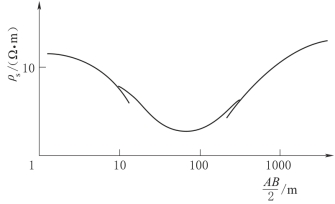 对称四极装置是把供电电极A、B和测量电极M、N对称地排列于测点的两侧,且在同一条测线上。工作中最小的A、B间距离应能使电测深曲线的首部为近似水平的线段,以便由它的渐近线直接求出第一电性层的电阻率ρ1。然后,逐渐增大A、B之间的距离,以增大勘探深度。最大A、B间距离应能满足勘探深度的要求,并能测得完整的尾部渐近曲线(不少于三个读数点),以便解释出最后一个电性层。在A、B间距离由小到大逐次增加的过程中,其增加的最大间距,应使有意义的最薄电性层所引起的ρs变化能在测深曲线上有所反映。一般应使各相邻电极距在双对数坐标纸上相距5~15mm,并均匀地分布,曲线变化处可适当加密极距。