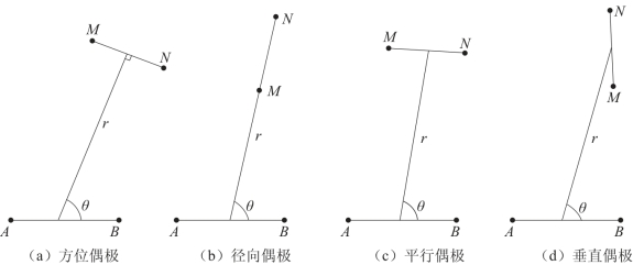 当AB和MN大大小于这两对电极之间的距离时,两个偶极形成的装置称为偶极装置。通常使用以下几种偶极装置类型:方位偶极、径向偶极、平行偶极、垂直偶极(图2-38)。θ角等于90°的方位偶极和平行偶极又称为赤道偶极装置,θ角等于0°的径向偶极和平行偶极又称为极向偶极或轴向偶极装置。偶极装置是利用逐渐增加两偶极的中心距来增加勘探深度的。记录点依具体情况和习惯可取MN的中点或AB的中点,也可取两偶极的中点。电测深曲线的横坐标以两偶极中心距为变量。这种装置所需电缆短,工作方便。但是当探测深度很大时,偶极装置测得的电位差相当小、观测精度下降。