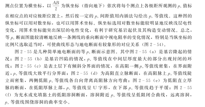 电测深曲线类型图的质量取决于对每一条测线曲线的认识是否正确。应先从孔旁测深曲线开始,并综合分析其周围电测深曲线的特点,避免漏层。决不能孤立地以个别电测深曲线外形确定其类型,如把不明显的KH型误定为A型,把不明显的HK型误定为Q型等。此外,还应该考虑电性层水平向变化的可能性,不能简单地根据两个地段曲线类型相同就得出地电断面相同的结论。