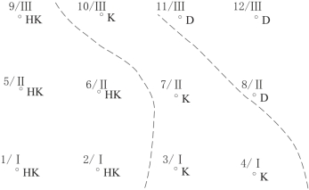 另一种电测深曲线类型图如图2-53所示。它是在测区测点平面分布图上,在测深点位置用文字符号注明相应点的曲线类型,划出分区界线。