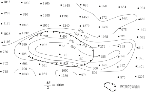 当测区内有高阻基岩时,电测深曲线尾部有45°渐近线。为了解基岩起伏情况,常编制纵向电导率S的平面图或剖面图。平面图的绘制方法是在按一定比例尺绘制的测点平面分布图上,在每个测深点位置上标明S值,然后勾绘S等值线平面图。S平面等值线的形态可以直接反映高阻基岩的起伏形态。