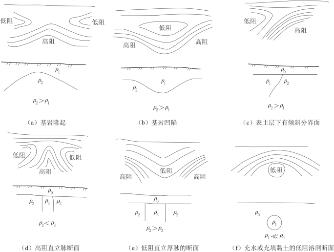 定性解释中要十分重视对电测深原始曲线的研究、分析和对比,应综合考虑电测深曲线的下列标志在测区内的变化:电测深曲线类型;曲线尾部上升或下降的渐近值及曲线倾斜角度;极值点、拐点等特殊点的纵横坐标值;总纵向电导值;各测点同一极距的ρs值;电测深曲线的局部畸变。分析中还应尽可能把同一电性层的电性参数在不同地段上的变化、同地电断面类型的变化(如某电性层的尖灭消失或重新出现)和几何形态的变化(如某电性层厚度、埋深的变化)区别开来。为此应密切结合不同地段上的电性参数资料,综合研究电测深曲线多方面的特点以及作多种定性图件的解释。