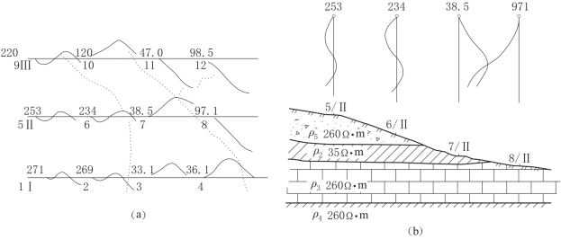 1、2、…、12—测点编号;Ⅰ、Ⅱ、Ⅲ—测线编号;253、234…—电测深曲线的首部电阻率值,Ω·m