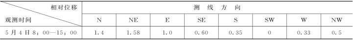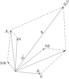 用向量法观测时,测出在一定时间内等位点在各测线上向外伸长的距离,然后以各方向上的伸长值,用矢量作图的方法求出伸长最大的方向,即为地下水流向。流向方向上伸长的距离除以两倍时间间隔,即求得地下水流速。例如,根据表3-1的资料,将相对方向相减求得各方向的相对位移为:N为1.4m;NE为1.58m,E为1.0m,NW为0.5m。矢量合成后得ΔR=3.6m,方向为N36°E(图3-22),地下水的流速为