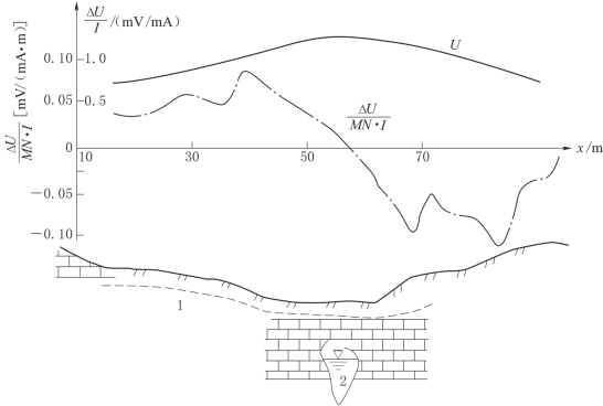 充电点放在地下暗河的露头(天窗)上,垂直暗河的可能走向布置测线,并进行电位或梯度测量。用电位法观测时,N极要放在异常场之外。图3-23即为观测结果,暗河上方附近出现电位极大值和梯度零值。把各剖面上电位曲线极大值点和电位梯度曲线的零值点连接起来,这个异常轴就是地下暗河在地面的投影。图3-24即为某铁路工区的实例,在a处布置两个验证孔,均见暗河。