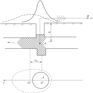 等电位线图中等位点移动最大的方向即为地下水流向。在水流方向的剖面上,量出不同时间观测的等位线的中心位移量OO'=xm,而xm为等位线在水流方向上伸长距离ΔR的一半,则地下水流速为