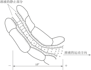 当地下水在岩石的孔隙或裂隙中运动时,由于岩石颗粒表面对地下水中正、负离子有选择的吸附作用,便出现了正、负离子分布的不均衡,从而形成自然电场,称为过滤电场或渗透电场。实践表明,大多数岩石颗粒具有吸附负离子的作用。因此,孔隙壁表面吸附了固定的负离子层,使运动着的地下水中正负离子的数目不相同,结果是多余的正离子出现在靠近孔隙出口的一端,在水流的反方向,则滞留着负离子。随着时间的延续,这种正、负离子分布的差异形成了电位差,形成一稳定的电场,其方向与地下水流方向相反(图3-26)。