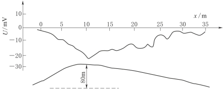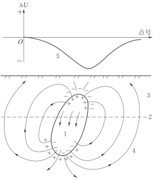 由于地形起伏形成的过滤电场常称为山地电场,这是潜水由山顶向山谷渗透时产生的,在山顶形成负电位,在山谷形成正电位(图3-27)。