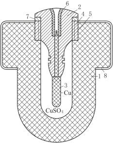 1—素瓷罐;2—胶木塞;3—铜棒;4—胶木环;5—密封胶;6—插孔;7—橡皮垫;8—涂釉层