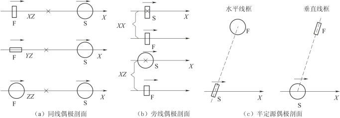 为表明收、发线圈中心轴的方向,作如下规定:X指测线方向、Y指垂直测线的水平方向,Z指垂直水平面的方向。如图4-6(a)中的旁线(XZ)装置,前一个字母X表示发射磁矩平行测线方向(即发射线圈法线平行测线方向),后一个字母Z表示接收线圈法线平行于Z轴。由于收、发线圈可分别取三个不同方向,故同线和旁线装置分别有九种组合方式,但有些装置实际上是等效的,如同线(XZ)和同线(ZX)装置的观测结果一样。收发线圈都直立或水平时,测量的是总合场;一个直立另一个水平时,测量的是二次场。