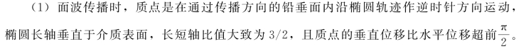 纵波和横波都在介质内部传播,统称为体波。它们随着时间的增加,向整个弹性空间的介质体内传播。还有另一类只存在于弹性界面附近的波动,称为面波。面波有两种,一种是沿介质与大气接触的自由表面传播的面波,称为瑞雷面波(或R波),它的特点如下: